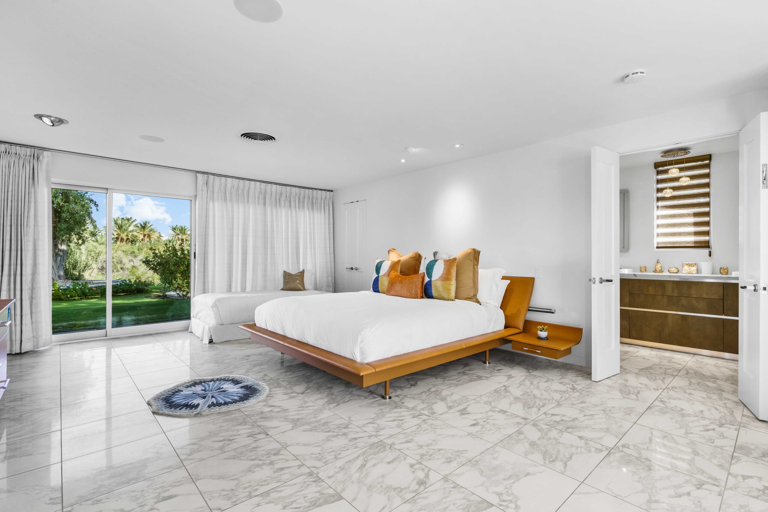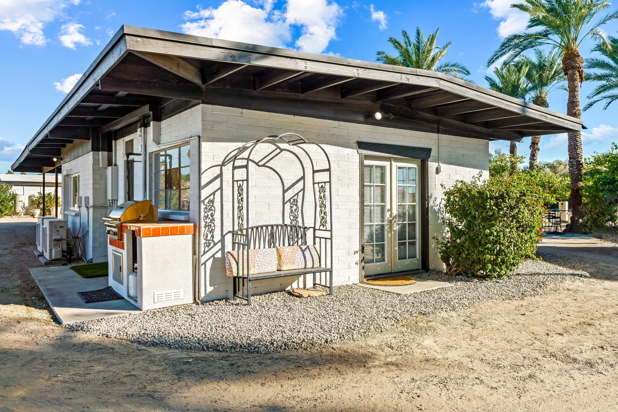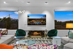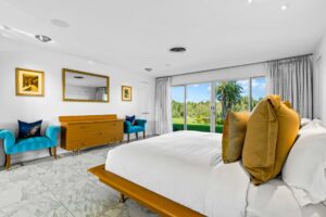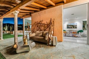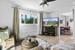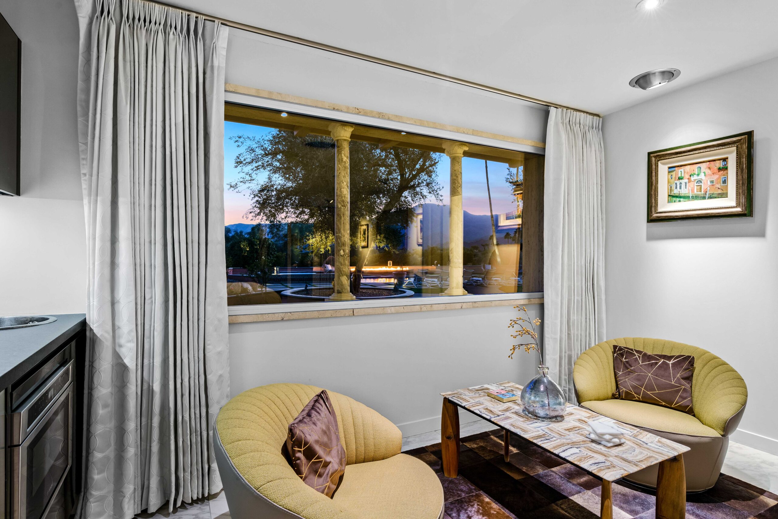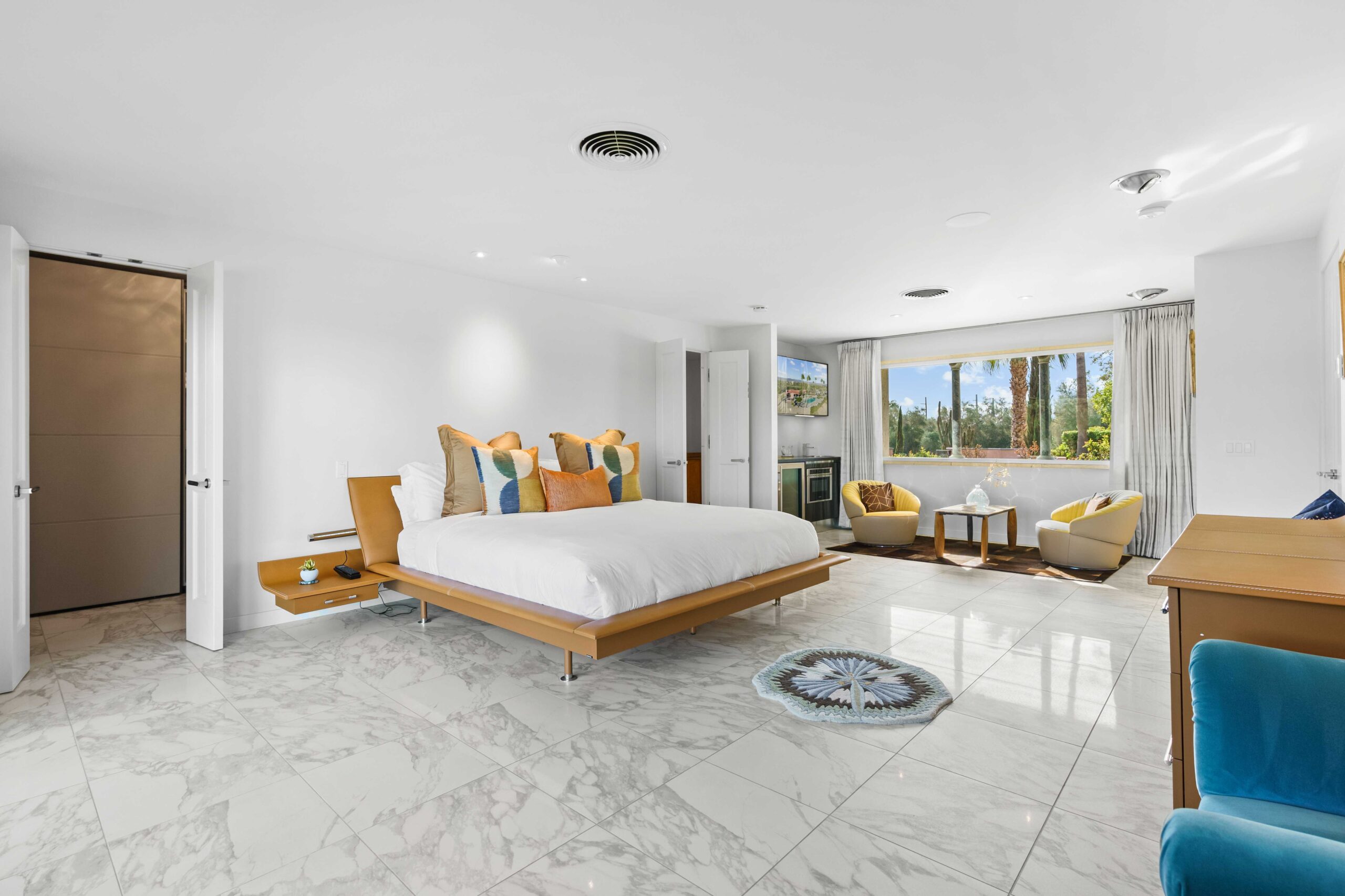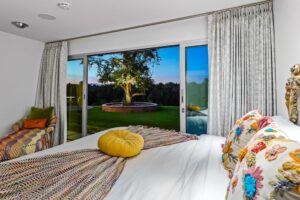 At The Olive Orchard Italian Villa, sophistication seamlessly blends with modern luxury. The villa is equipped with smart home Control 4 technology, custom cabinetry imported from Italy, and top-of-the-line appliances designed to cater to your every need. The sleek living room features a contemporary design with a hidden TV and a bar that rises at the touch of a button, allowing you to effortlessly transition from a cozy movie night to cocktails with friends. Two beautifully designed bedrooms in the main house are adorned with plush linens and unique decor, each boasting sliding doors that lead to spacious walk-in closets and mirrors that double as screens for your favorite shows. For added privacy, a charming detached casita with its own cozy bedroom awaits your guests or family.