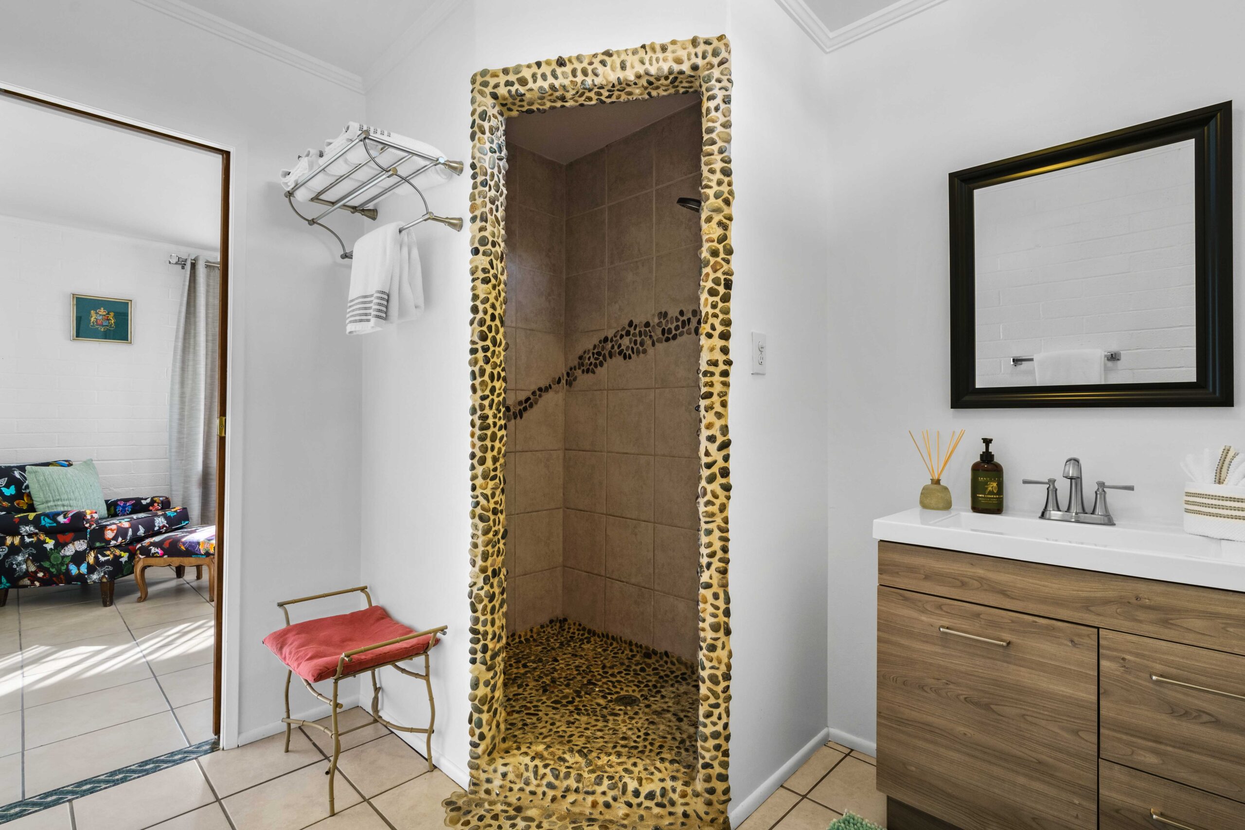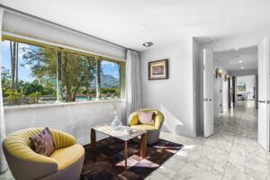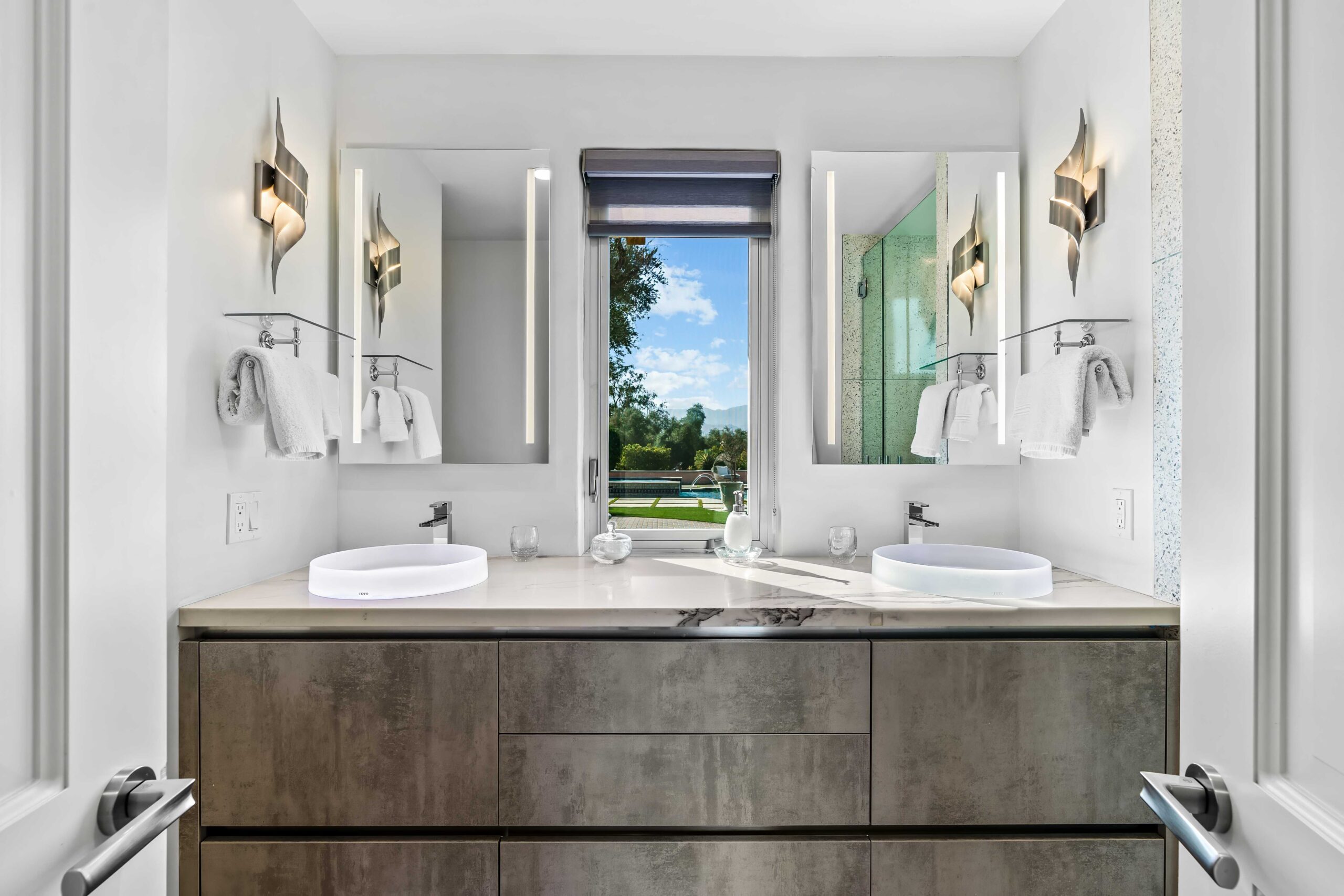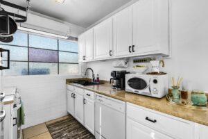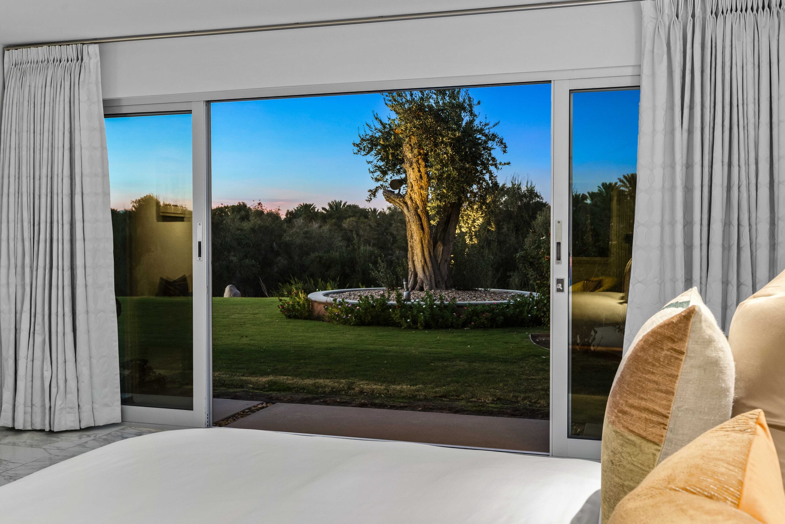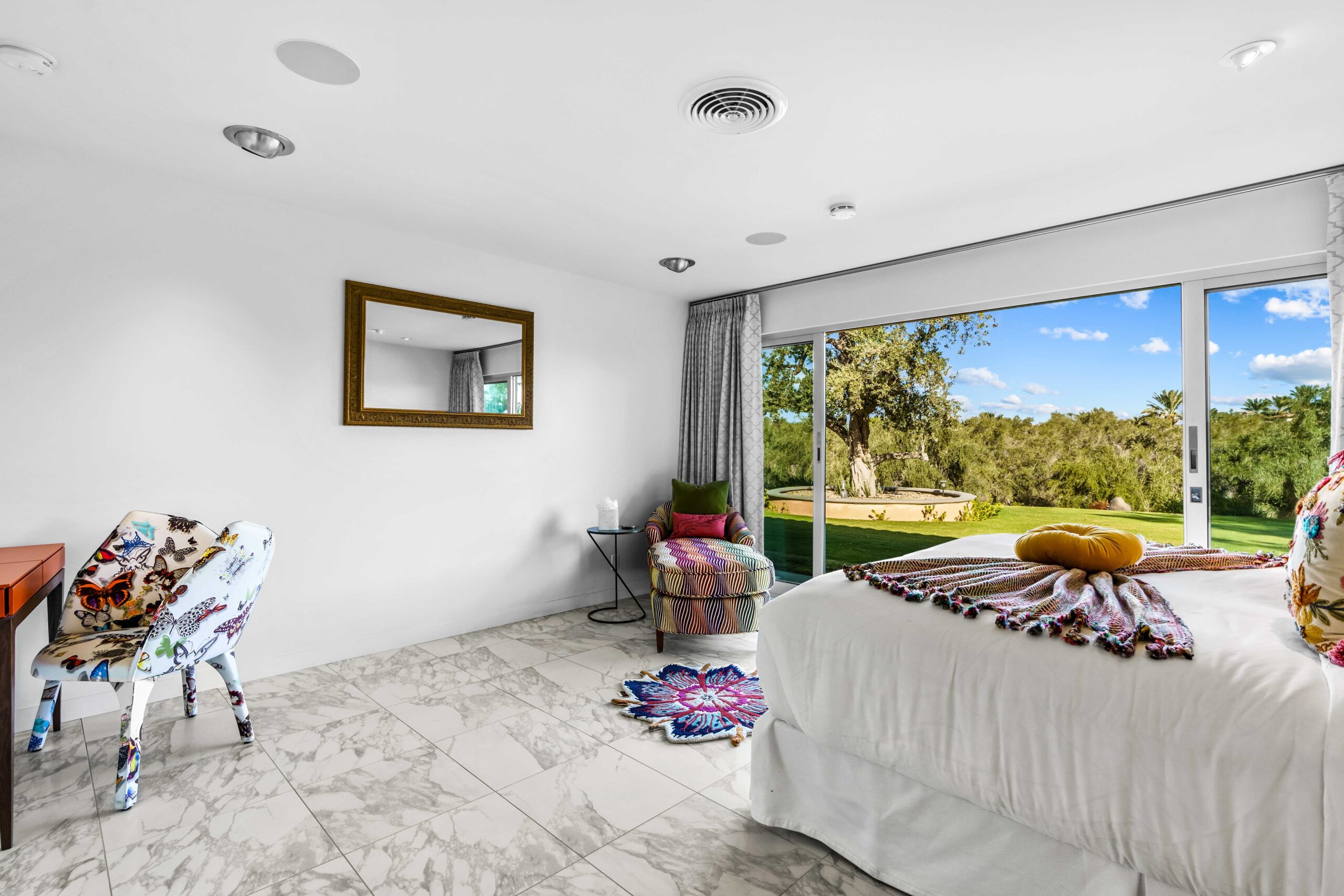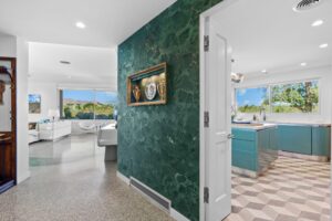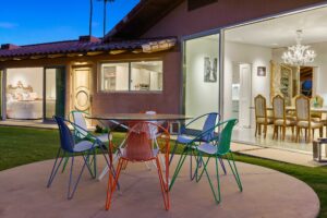 At The Olive Orchard Italian Villa, sophistication seamlessly blends with modern luxury. The villa is equipped with smart home Control 4 technology, custom cabinetry imported from Italy, and top-of-the-line appliances designed to cater to your every need. The sleek living room features a contemporary design with a hidden TV and a bar that rises at the touch of a button, allowing you to effortlessly transition from a cozy movie night to cocktails with friends. Two beautifully designed bedrooms in the main house are adorned with plush linens and unique decor, each boasting sliding doors that lead to spacious walk-in closets and mirrors that double as screens for your favorite shows. For added privacy, a charming detached casita with its own cozy bedroom awaits your guests or family.