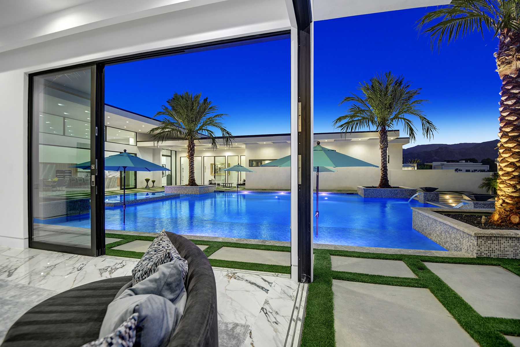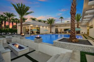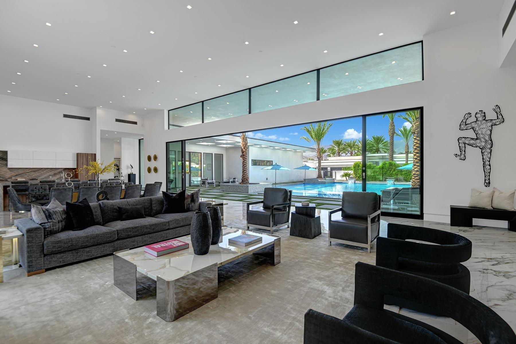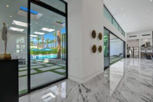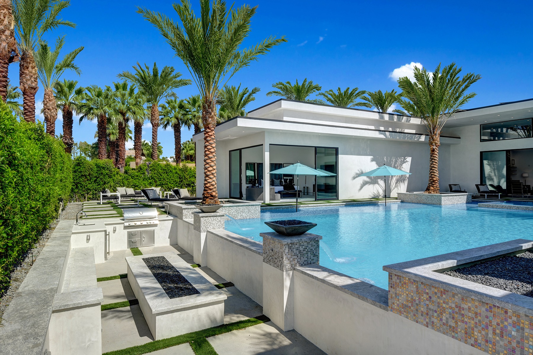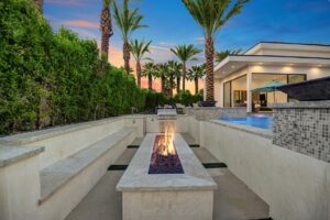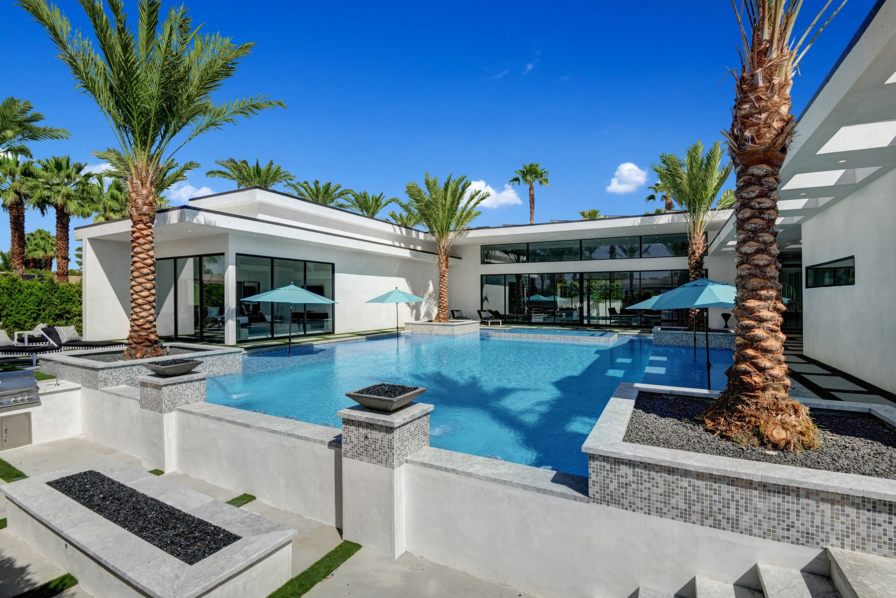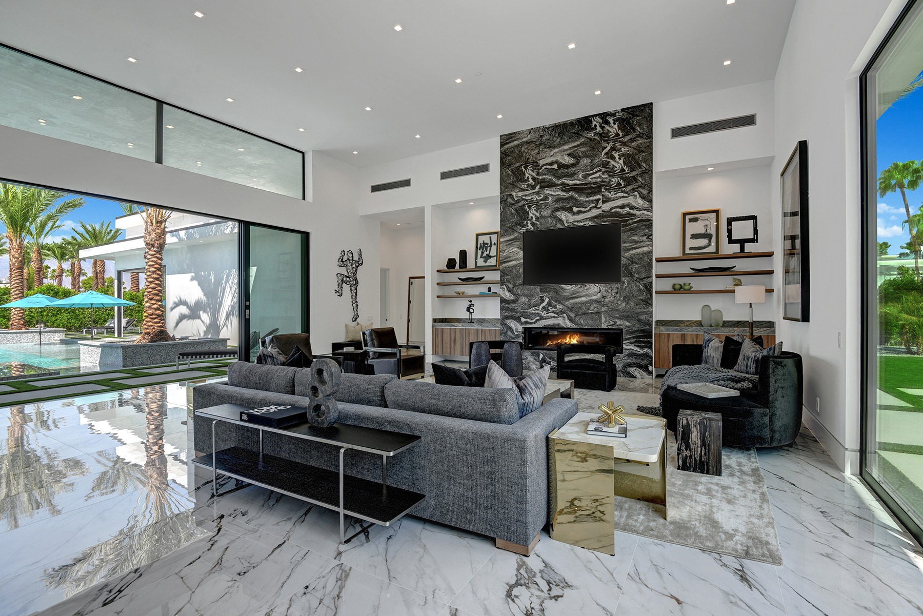 Introduced by an elegant gated courtyard, this single-level estate features an oversized pool with two tiled Baja shelves and a step-down bar area with fire pit. A pivoting glass entry door opens to an equally impressive interior with soaring ceilings, walls of fold-away glass doors, gorgeous polished marble imported from Spain, and sleek custom cabinetry imported from Germany and Hansgroge fixtures in all bathrooms and kitchen. A gallery-sized great room with dramatic linear fireplace provides space for grand-scale entertaining that opens to the kitchen, backyard, and the pool and spa. Enjoy 5 ensuite bedrooms and 5.5 baths in approximately 4,900 square feet, including Fleetwood doors and windows, Miele appliances including built-in coffee stations, smart-home lighting and communications systems, primary suite walk-in closets with built-in Italian cabinetry, illuminated bath mirrors, solar power and 3-car garages with epoxy flooring. This prestigious residential collection is moments from The Ritz-Carlton Resort & Spa, Sunnylands, Palm Springs International Airport, and luxury shopping and fine dining.