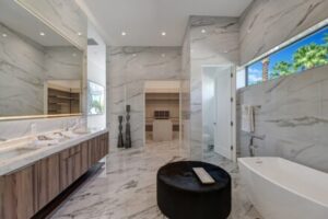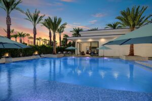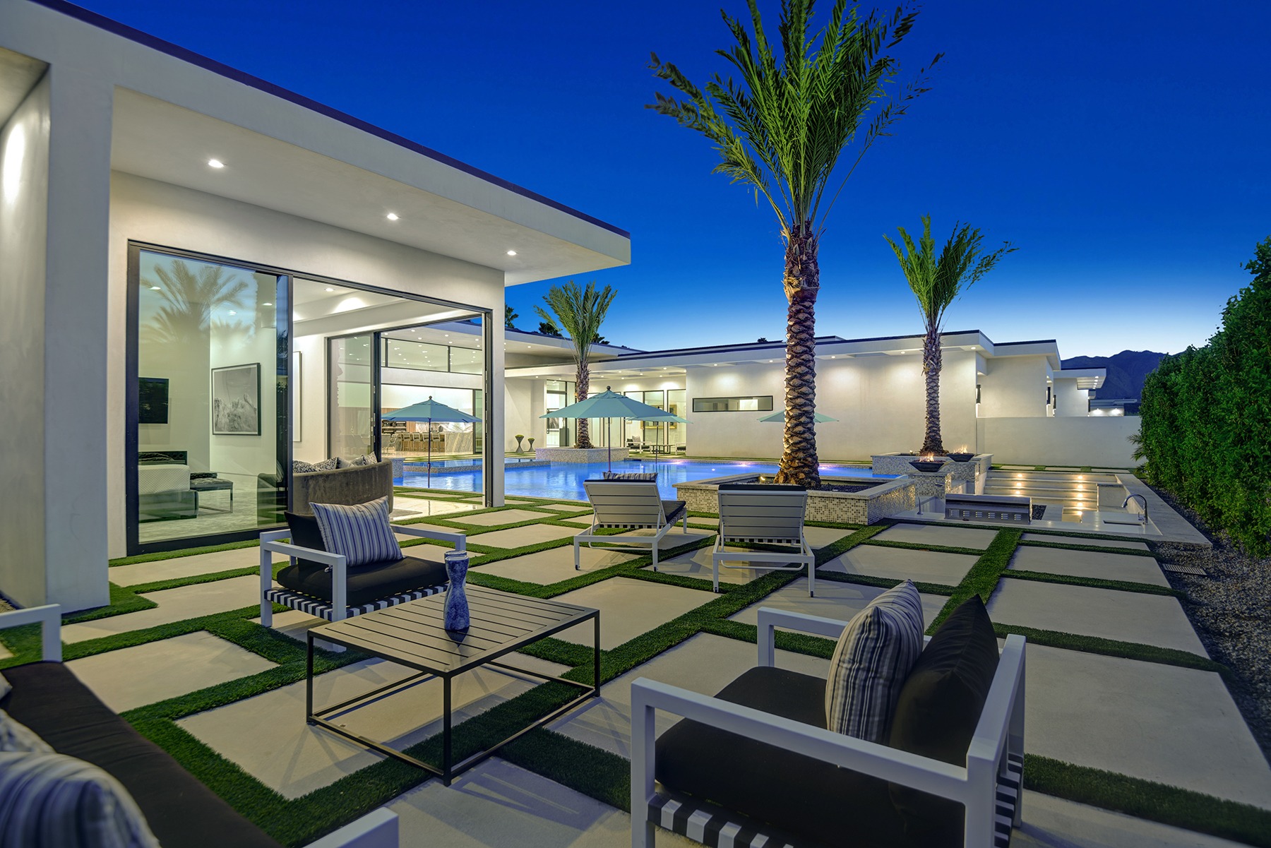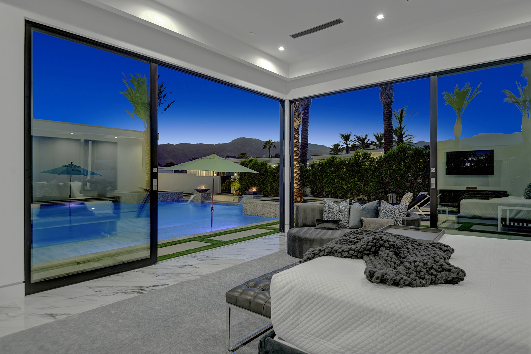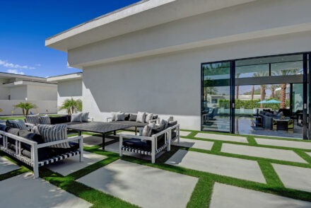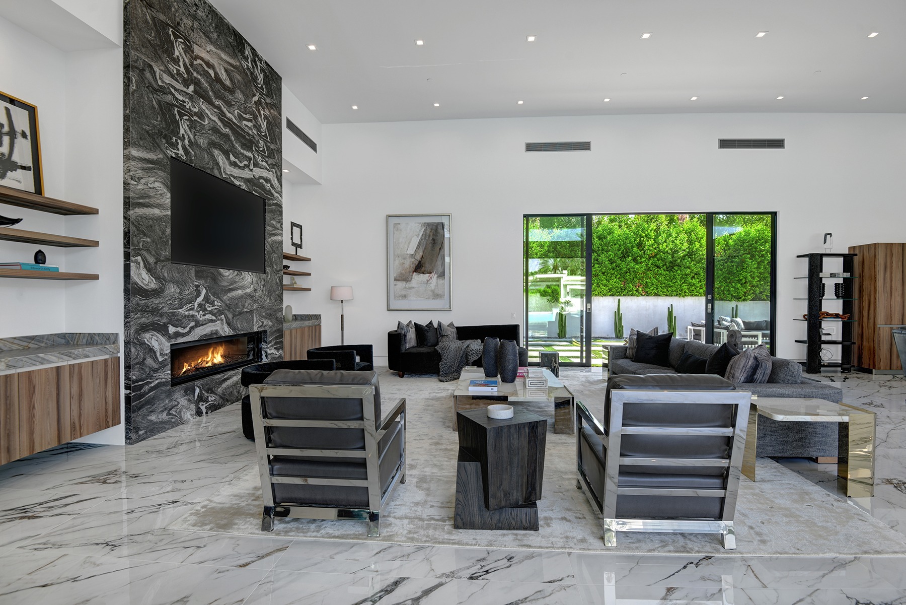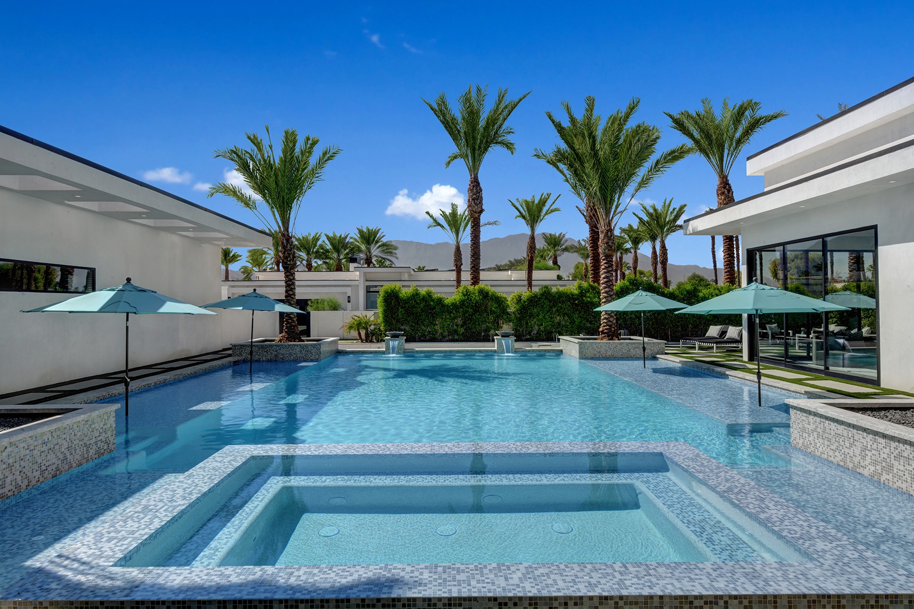 Introduced by an elegant gated courtyard, this single-level estate features an oversized pool with two tiled Baja shelves and a step-down bar area with fire pit. A pivoting glass entry door opens to an equally impressive interior with soaring ceilings, walls of fold-away glass doors, gorgeous polished marble imported from Spain, and sleek custom cabinetry imported from Germany and Hansgroge fixtures in all bathrooms and kitchen. A gallery-sized great room with dramatic linear fireplace provides space for grand-scale entertaining that opens to the kitchen, backyard, and the pool and spa. Enjoy 5 ensuite bedrooms and 5.5 baths in approximately 4,900 square feet, including Fleetwood doors and windows, Miele appliances including built-in coffee stations, smart-home lighting and communications systems, primary suite walk-in closets with built-in Italian cabinetry, illuminated bath mirrors, solar power and 3-car garages with epoxy flooring. This prestigious residential collection is moments from The Ritz-Carlton Resort & Spa, Sunnylands, Palm Springs International Airport, and luxury shopping and fine dining.