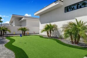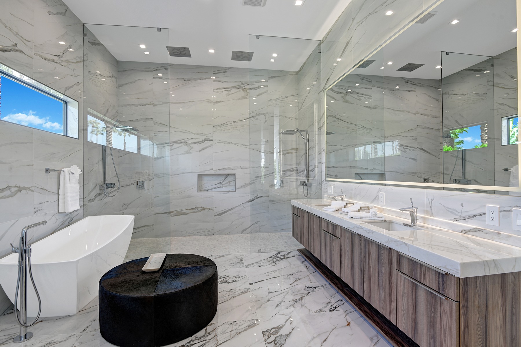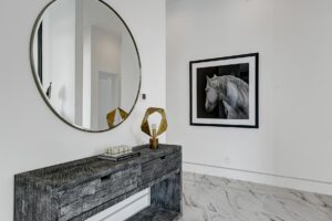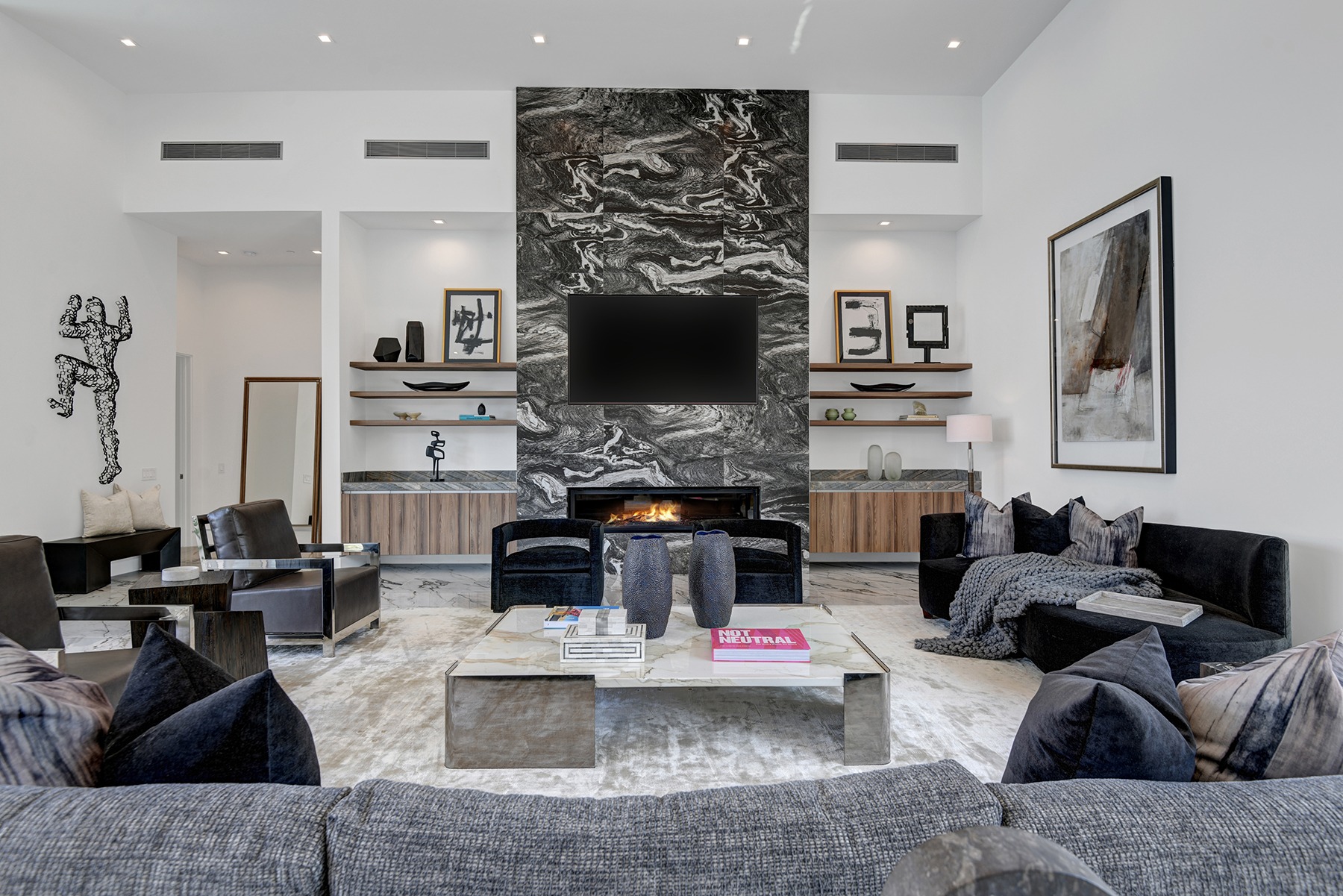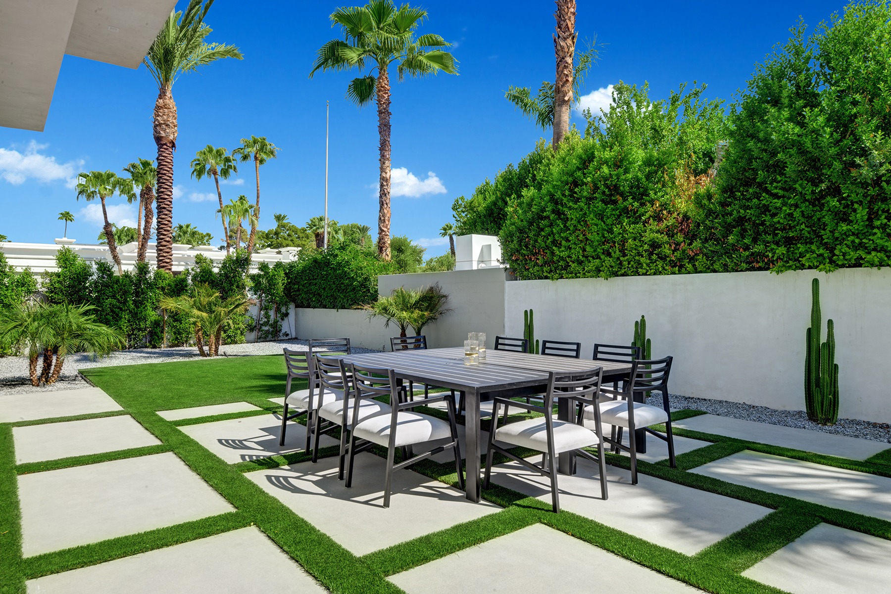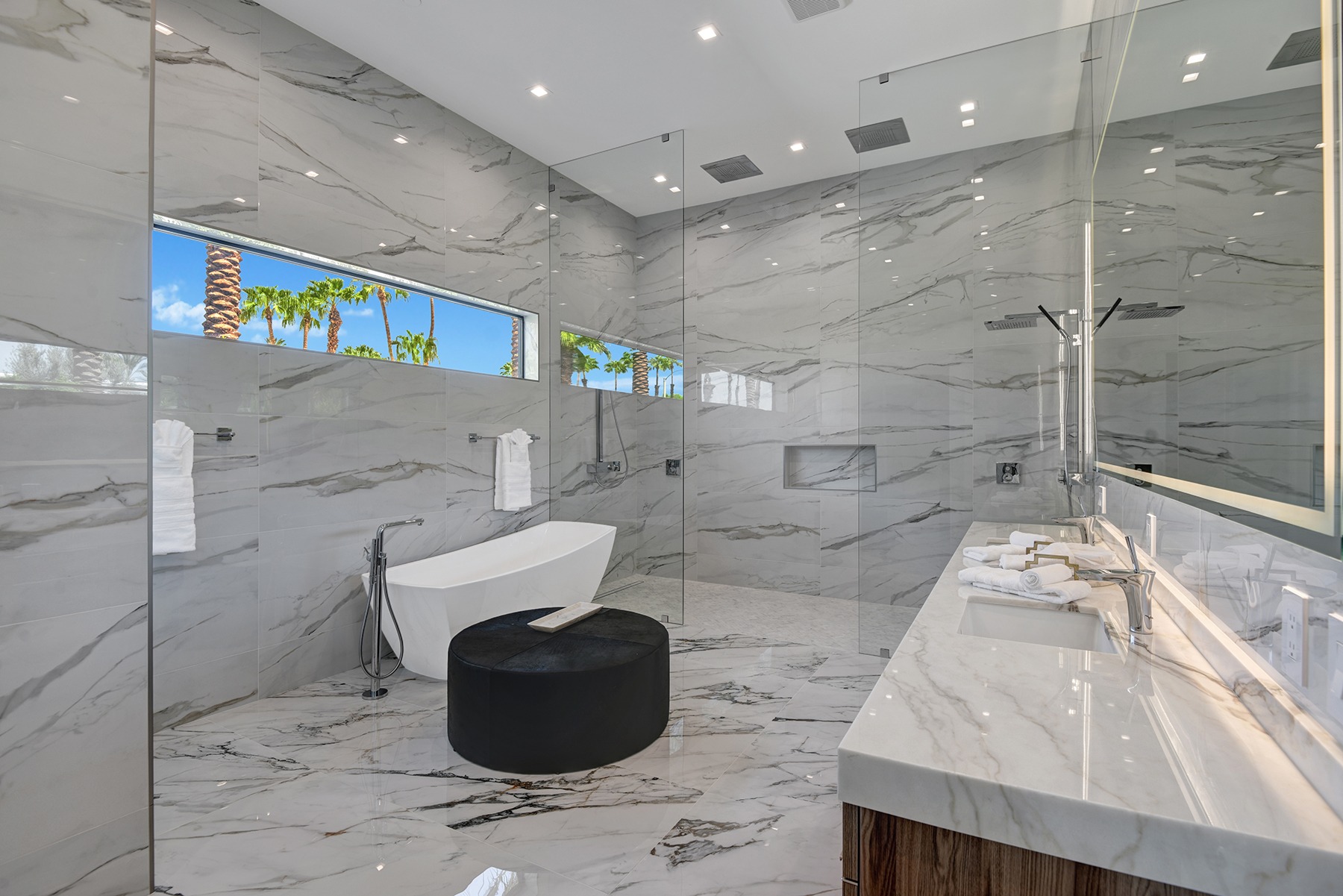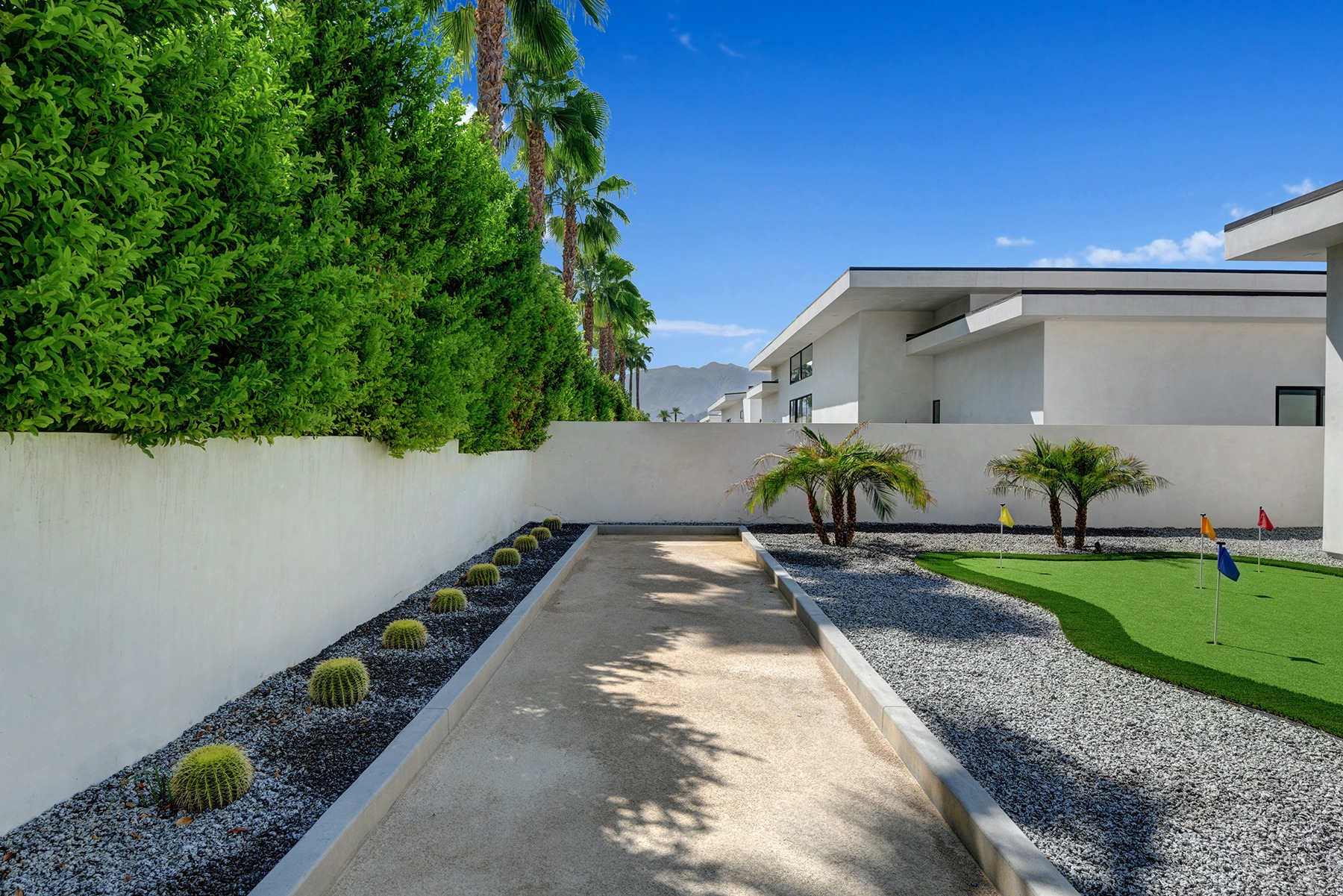 Introduced by an elegant gated courtyard, this single-level estate features an oversized pool with two tiled Baja shelves and a step-down bar area with fire pit. A pivoting glass entry door opens to an equally impressive interior with soaring ceilings, walls of fold-away glass doors, gorgeous polished marble imported from Spain, and sleek custom cabinetry imported from Germany and Hansgroge fixtures in all bathrooms and kitchen. A gallery-sized great room with dramatic linear fireplace provides space for grand-scale entertaining that opens to the kitchen, backyard, and the pool and spa. Enjoy 5 ensuite bedrooms and 5.5 baths in approximately 4,900 square feet, including Fleetwood doors and windows, Miele appliances including built-in coffee stations, smart-home lighting and communications systems, primary suite walk-in closets with built-in Italian cabinetry, illuminated bath mirrors, solar power and 3-car garages with epoxy flooring. This prestigious residential collection is moments from The Ritz-Carlton Resort & Spa, Sunnylands, Palm Springs International Airport, and luxury shopping and fine dining.