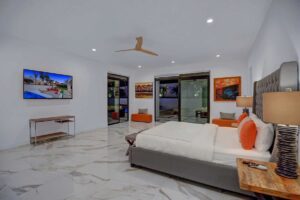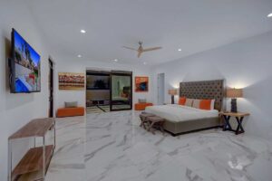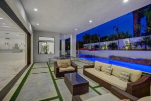 Patio is connected to the living room with a massive pocket door which completely folds inside the wall and makes the living room feel that is connected with the pool and outside areas. Feels great to open the pocket door and hear the sound of the waterfalls. Pocket door is twenty feet long. Inside the house owner didn’t care for cost, and everything has been custom made. The kitchen contains all German appliances, a commercial fridge, and the entire kitchen is made of Quartz, including the dining table that serves eight people. Living area has a wonderful fireplace, a gorgeous bar with a fridge, also made of Quartz, and a 75 inch Sony 4k Plasma.